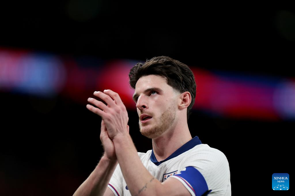 England's Declan Rice applauds during a friendly football match between England and Wales at Wembley Stadium in London, Britain, Oct. 9, 2025. (Xinhua/Li Ying)