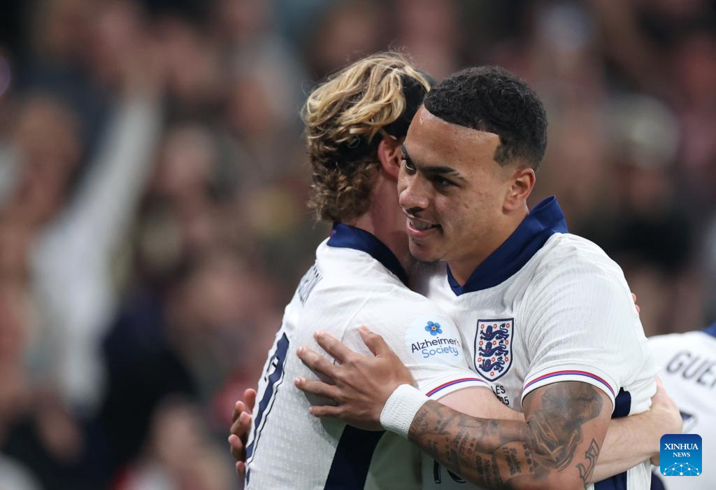 England's Morgan Rogers (R) celebrates with his teammate Anthony Gordon after scoring his side's opening goal during a friendly football match between England and Wales at Wembley Stadium in London, Britain, Oct. 9, 2025. (Xinhua/Li Ying)