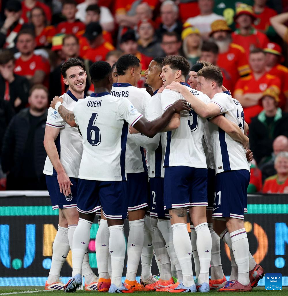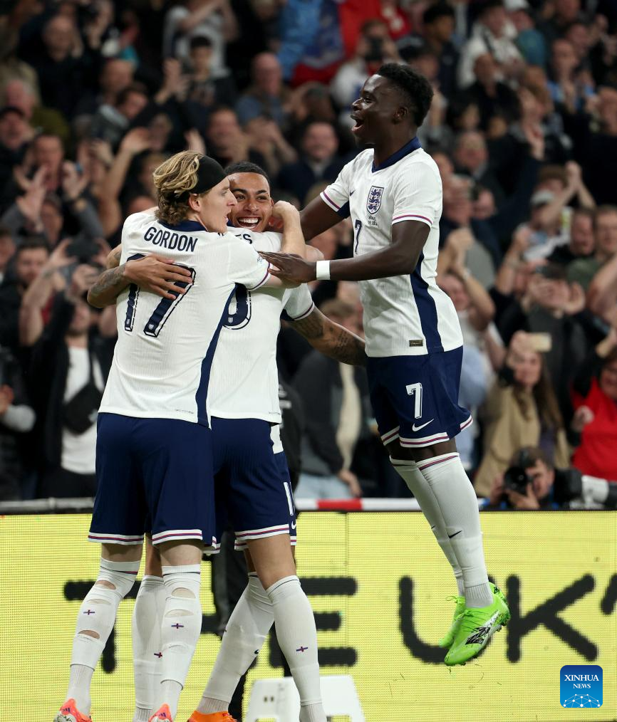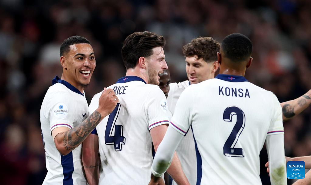 England's players celebrate scoring during a friendly football match between England and Wales at Wembley Stadium in London, Britain, Oct. 9, 2025. (Xinhua/Li Ying)