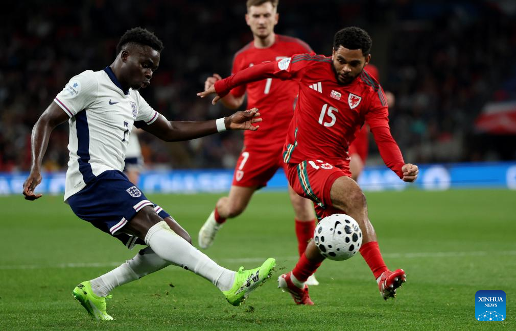 England's Bukayo Saka (1st L) scores his side's third goal during a friendly football match between England and Wales at Wembley Stadium in London, Britain, Oct. 9, 2025. (Xinhua/Li Ying)