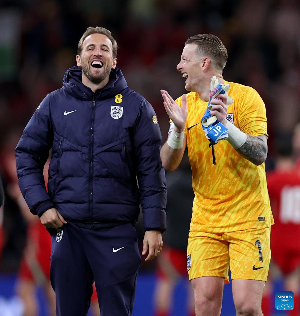 England's Harry Kane (L) and goalkeeper Jordan Pickford laugh after during a friendly football match between England and Wales at Wembley Stadium in London, Britain, Oct. 9, 2025. (Xinhua/Li Ying)