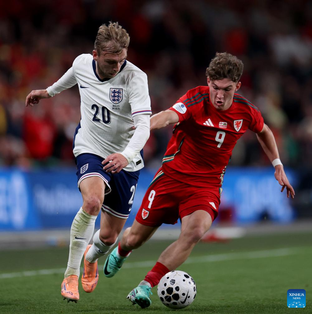 England's Jarrod Bowen (L) vies with Wales' Lewis Koumas during a friendly football match between England and Wales at Wembley Stadium in London, Britain, Oct. 9, 2025. (Xinhua/Li Ying)