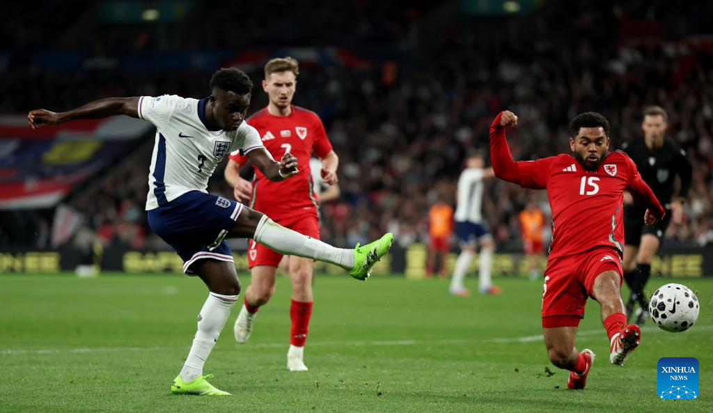 England's Bukayo Saka (L) shoots during a friendly football match between England and Wales at Wembley Stadium in London, Britain, Oct. 9, 2025. (Xinhua/Li Ying)