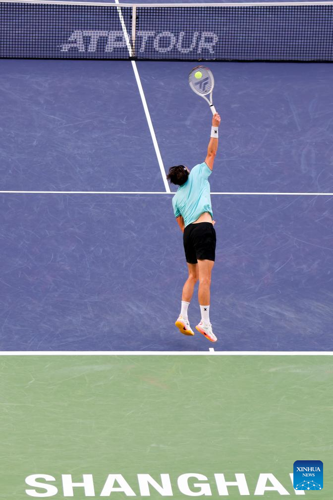 Arthur Rinderknech of France serves to Felix Auger-Aliassime of Canada during the men's singles quarterfinal at the ATP World Tour Shanghai Masters tennis tournament in Shanghai, east China, Oct. 10, 2025. (Xinhua/Wang Xiang)