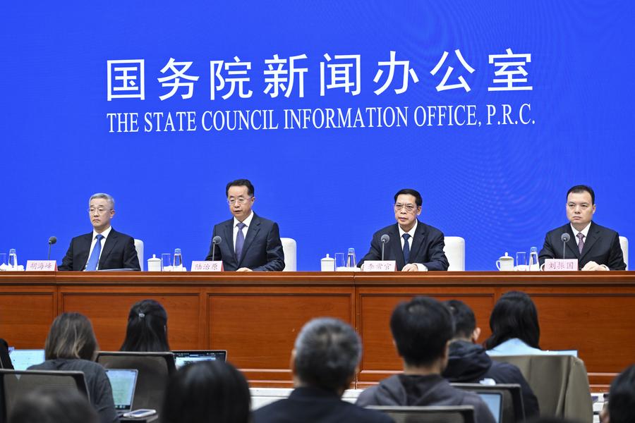 Lu Zhiyuan, China's minister of civil affairs, and Li Changguan, Hu Haifeng, and Liu Zhenguo, all vice ministers of civil affairs, attend a press conference held by the State Council Information Office (SCIO) on achievements in civil affairs during the 14th Five-Year Plan period (2021-2025) in Beijing, capital of China, Oct. 10, 2025. (Xinhua/Li Xin)