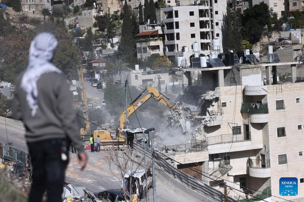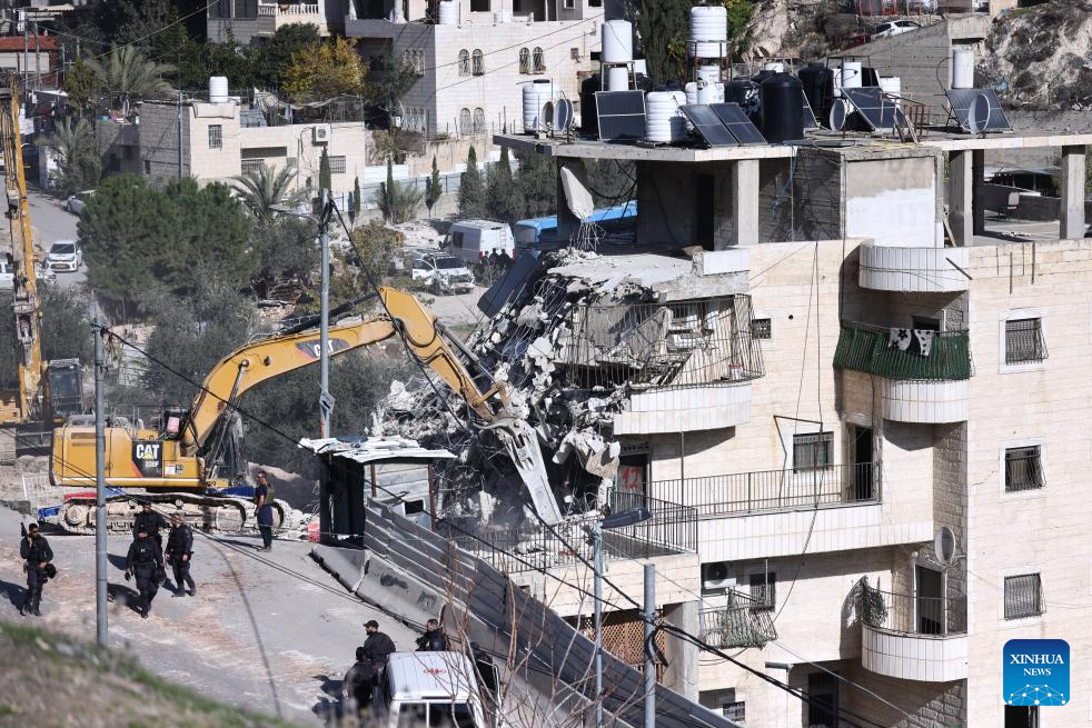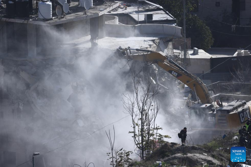 An excavator demolishes a residential building in the Silwan neighborhood of east Jerusalem, on Dec. 22, 2025. Israeli forces on Monday demolished a four-floor residential building in Silwan, a Palestinian neighborhood in east Jerusalem. The apartment building, home to about 90 Palestinian residents living in 13 residential units, was the largest residential structure demolished in the area this year, according to Israeli rights group Ir Amim. (Photo by Jamal Awad/Xinhua)