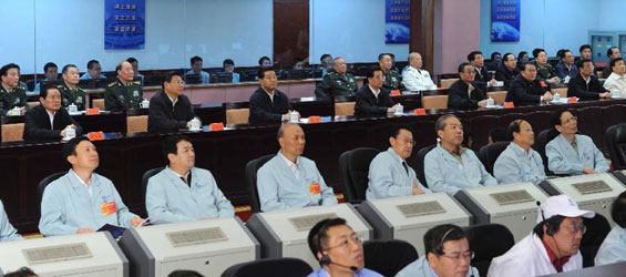 Chinese President Hu Jintao watches the launch of Tiangong-1 space lab module at Beijing Aerospace Control Center in Beijing, capital of China, Sept. 29, 2011.