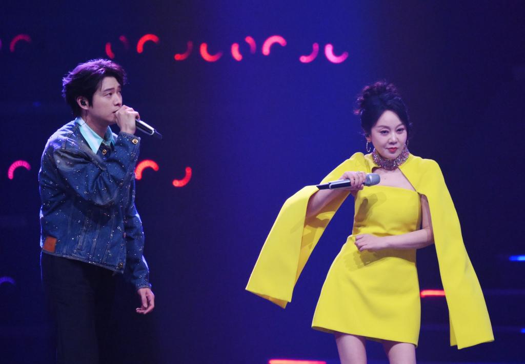 9月28日,王力宏(左)和单依纯在演唱《落叶归根》。新华社发(张金加摄)