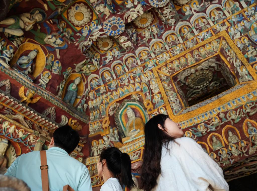 10月9日,在位于今潮8弄的户外展区,参观者游览云冈第12窟“音乐窟”的1:1复制洞窟。