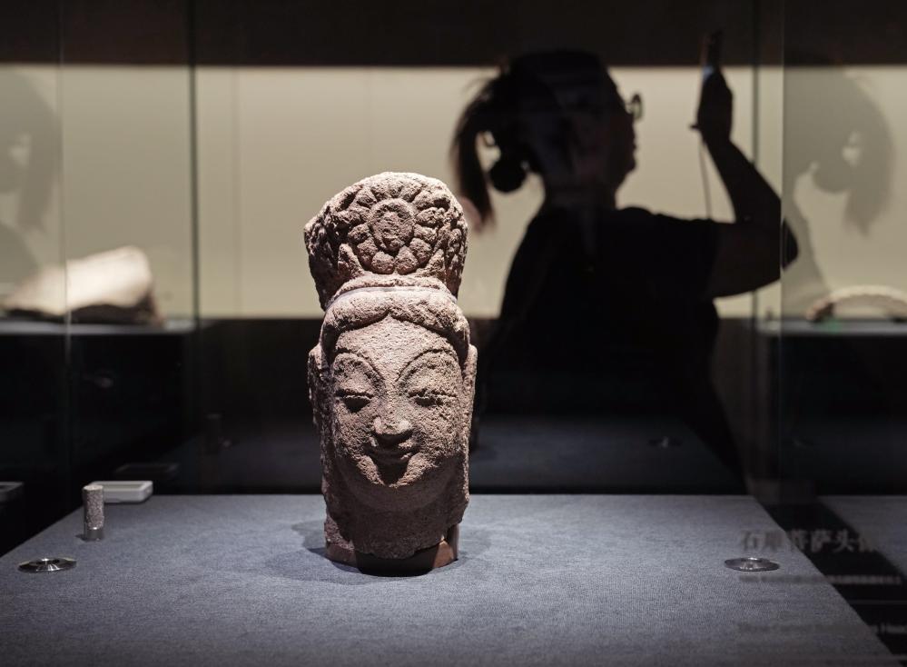 10月9日,参观者在趣看美术馆参观云冈文物。