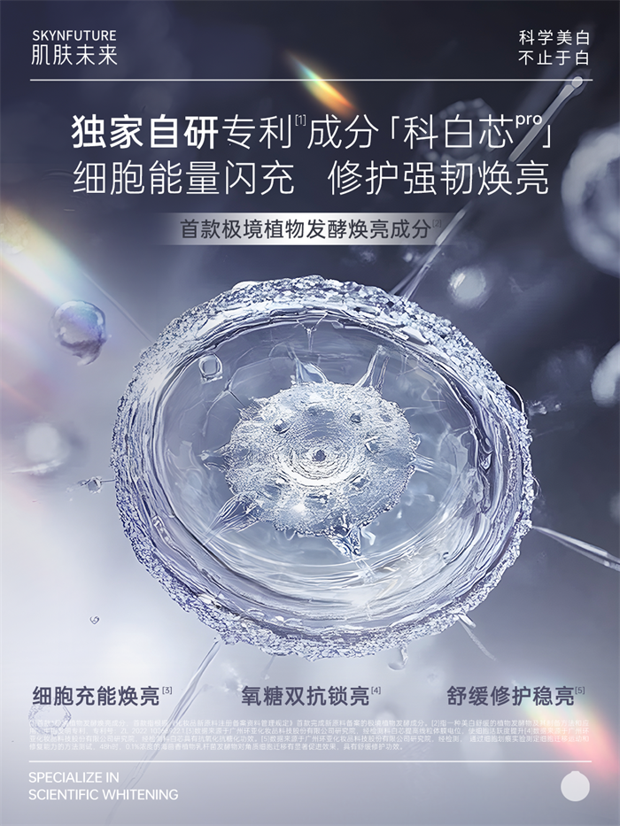 在展会上,肌肤未来发布了多维度国人肤色评价体系与独家自研专利成分“科白芯”。据了解,品牌从国人的肤色特色和审美需求出发,并结合心理学、行为科学与统计学原理,自主创新研发了一套涵盖28个维度的多维度数字化肤色评价体系。该评价体系精准识别了影响不同人群肤色感知的关键因素,为产品研发提供了科学依据,并为未来个性化肤色解决方案奠定了坚实的数字化基础。