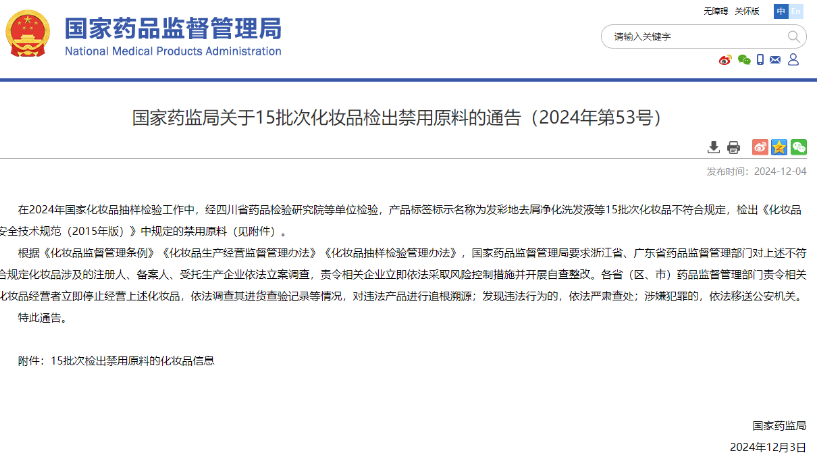 國(guó)家藥監(jiān)局關(guān)于15批次化妝品檢出禁用原料的通告(2024年第53號(hào))