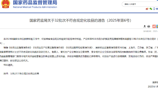 國(guó)家藥監(jiān)局關(guān)于32批次不符合規(guī)定化妝品的通告(2025年第6號(hào))