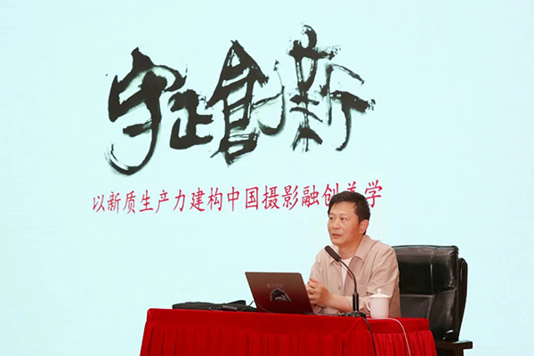 展览开幕之后,李舸以《守正创新——以新质生产力建构中国摄影融创美学》为题授课,从具体实例出发,强调坚定文化自信、秉持开放包容、坚持守正创新的重要意义和实践路径。从中国文化的“两创”如何应对新质生产力时代的机遇和挑战;如何在艺术与科技的融合创新中,寻求中国摄影的美学新路径;中国摄影艺术创作,如何在科技的助力下实现高质量跃升等方面,结合生活哲学、艺术美学、摄影与音乐、美术、书法创作等多个维度,启发摄影爱好者如何以新质生产力建构中国摄影融创美学。