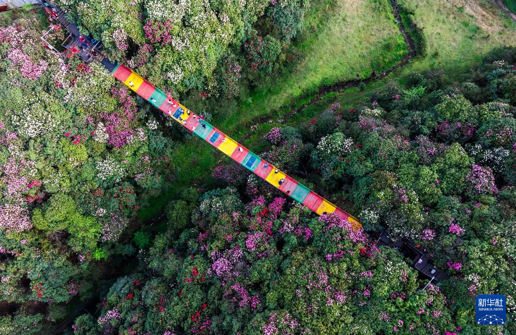 413日,游客在贵州省毕节市百里杜鹃管理区金坡景区观景赏花(无人机照片)。