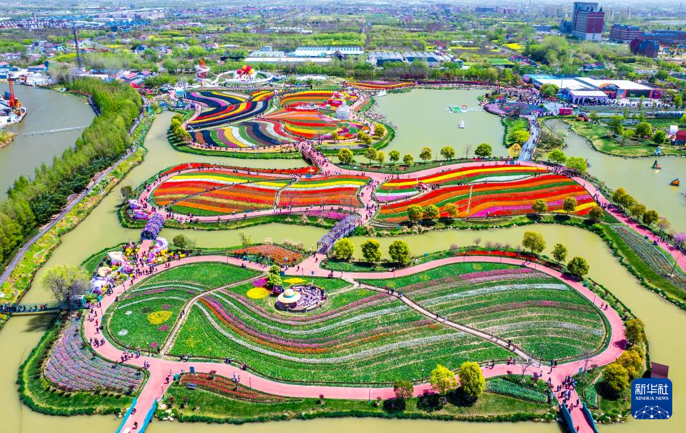 413日,游客在江苏省盐城市大丰区荷兰花海景区内赏花游玩(无人机照片)。