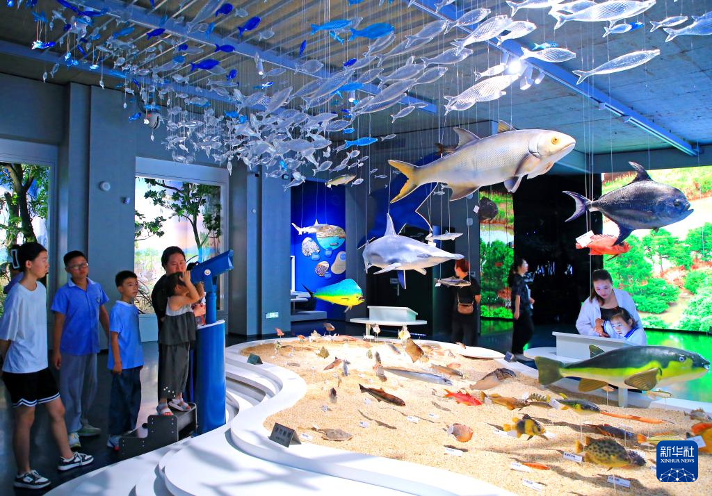 家长带着孩子在位于浙江省玉环市的玉环博物馆参观游览。