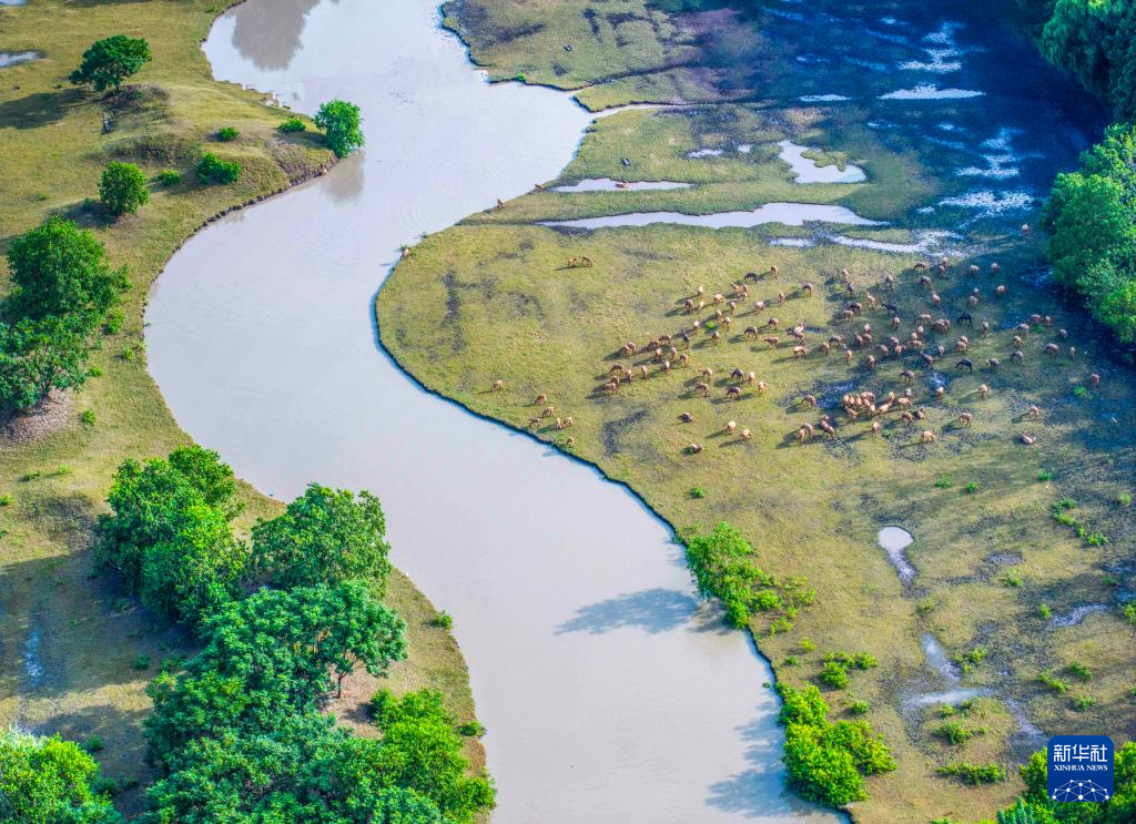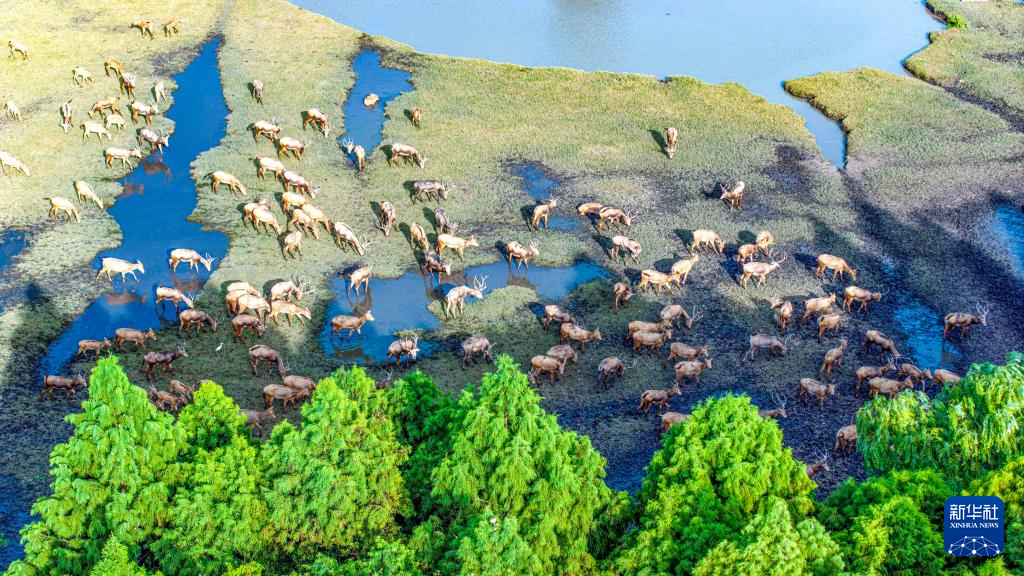 9月11日,在江苏省泰州市姜堰区溱湖国家湿地公园,一群麋鹿在觅食、嬉戏(无人机照片)。