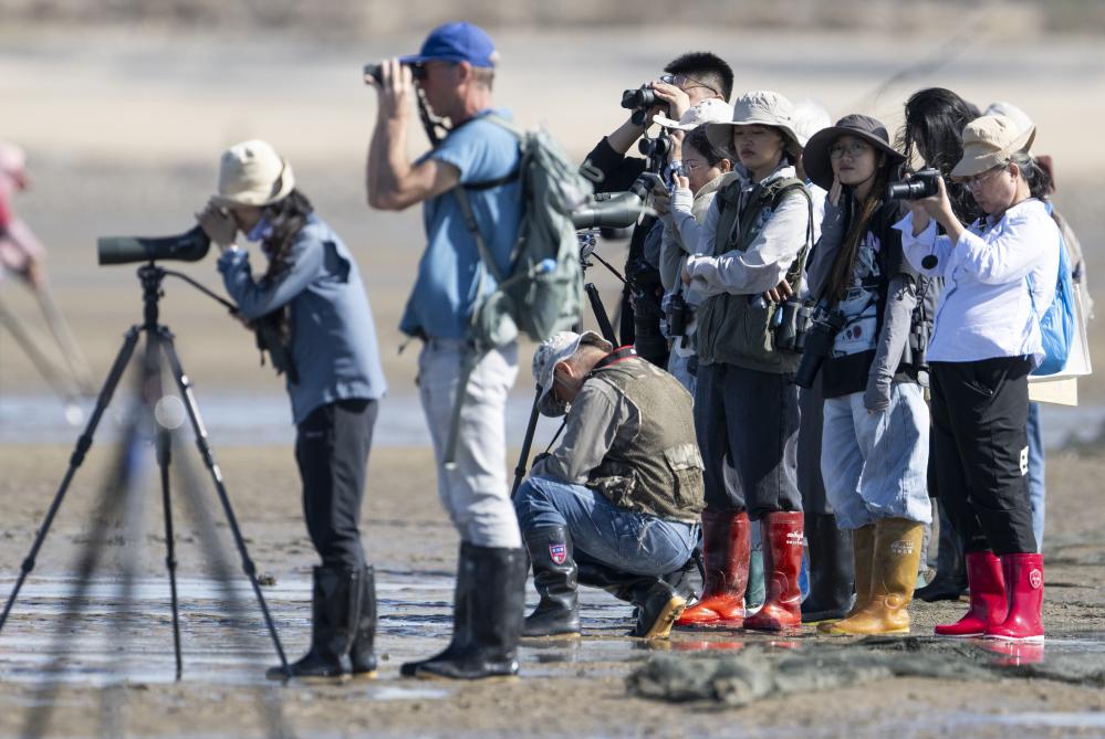 11月9日,中外观鸟爱好者在泉州围头湾滩涂上观测勺嘴鹬。