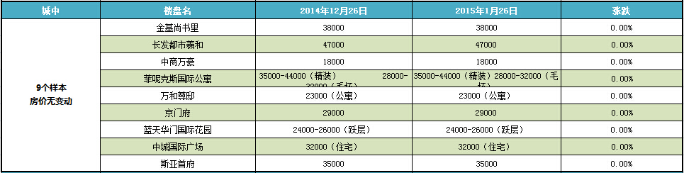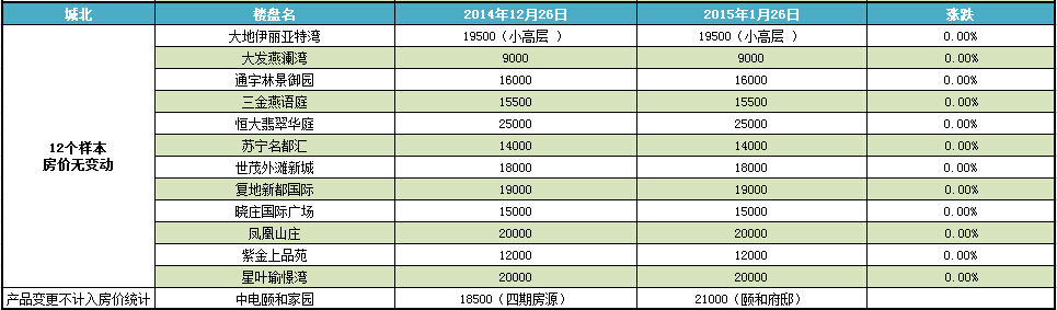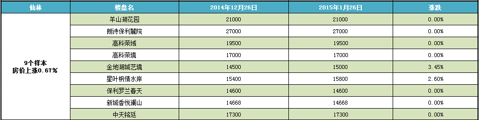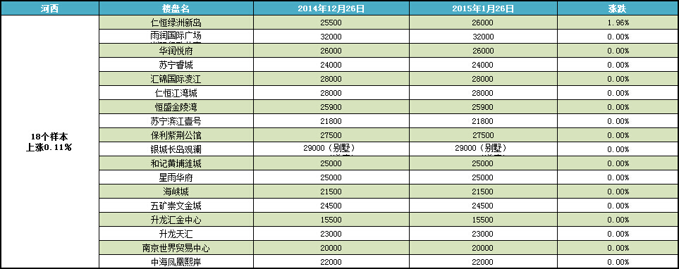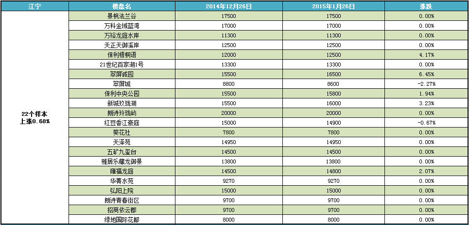 新華房產(chǎn)記者統(tǒng)計(jì)發(fā)現(xiàn),2015年1月南京樓市八大板塊中,江寧、仙林、河西、城東房?jī)r(jià)上漲,江北房?jī)r(jià)下跌,其余板塊房?jī)r(jià)無變動(dòng)。 綜合結(jié)果,1月房?jī)r(jià)環(huán)比微漲0.22%。[詳細(xì)]