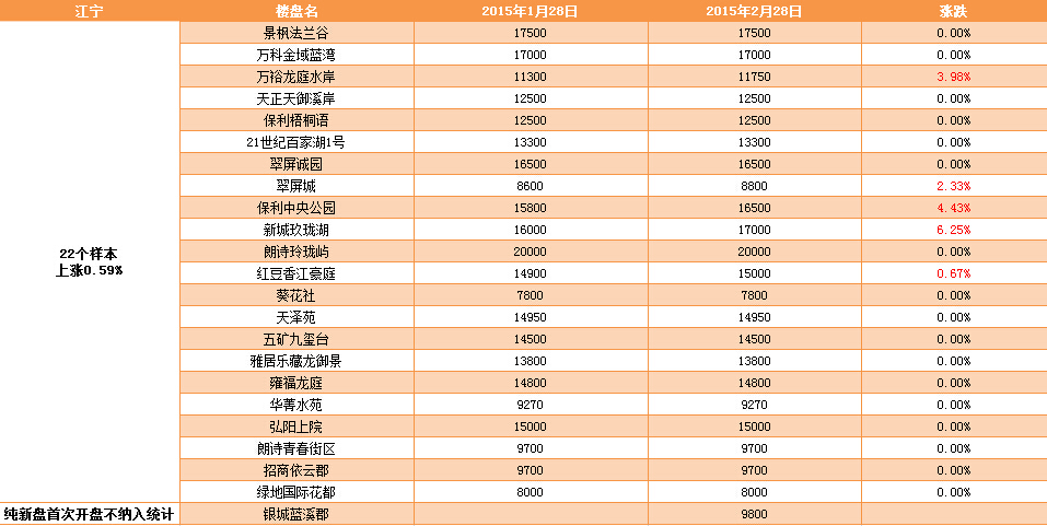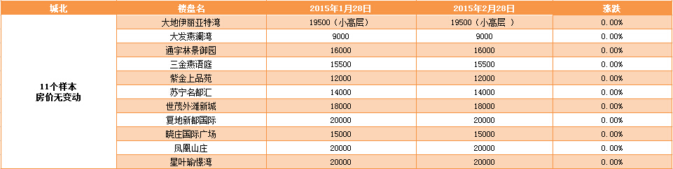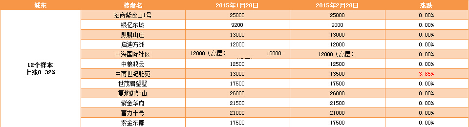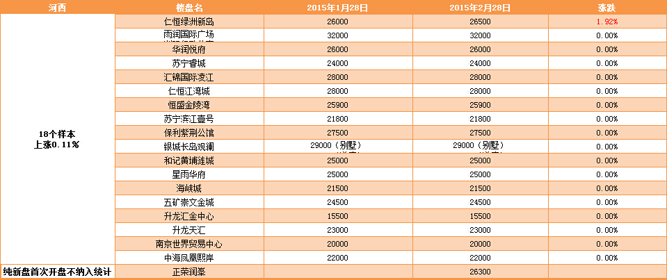 新華房產(chǎn)記者統(tǒng)計(jì)發(fā)現(xiàn),2015年2月南京樓市八大板塊中,江寧、河西、城東房價(jià)上漲,江北房價(jià)下跌,其余板塊房價(jià)無變動(dòng)。 綜合結(jié)果,2月房價(jià)環(huán)比微漲0.12%。 [詳細(xì)]