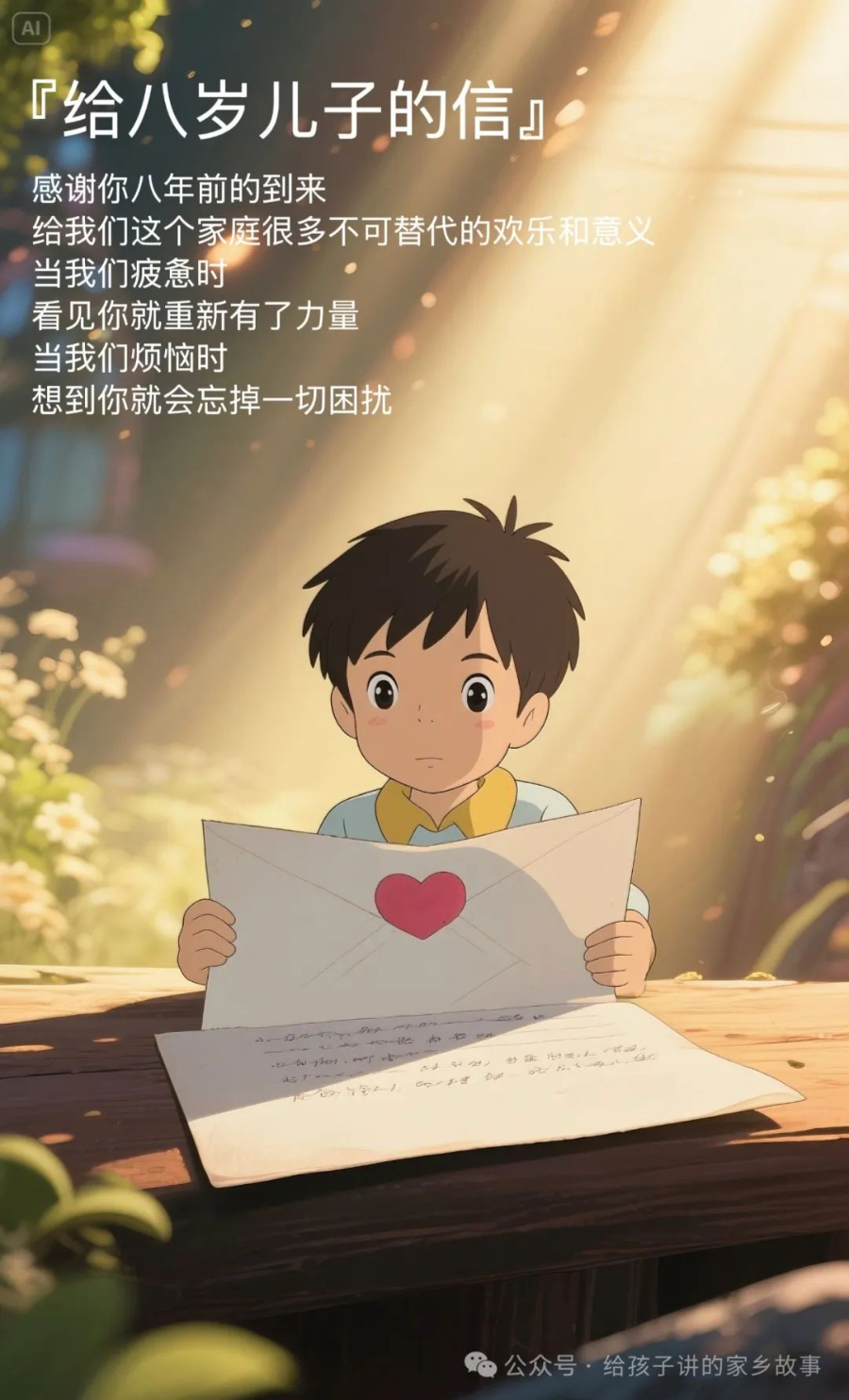 这是第二次给你写信。幼儿园毕业时曾因学校要求给你写过第一封信。不知道你还记不记得?在给你讲家乡故事的这些日子里,我进一步感到,时间对每个人本质上虽然是一样的,但其给孩子与大人的感受却是不一样的。虽然孩子们常说等不及了要长大,但孩子们不会觉得长大是个很快的过程。但对于大人来说,两年的确是转眼之间,除了变老之外可能没有什么可感知的改变,但对于孩子来说,每年不短,每天可以过得很充实。这几年特别是你读小学的这两年,我们看到你天天都有新的变化、新的收获、新的成长。