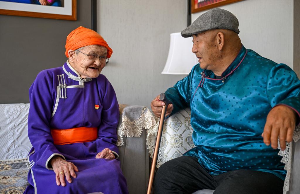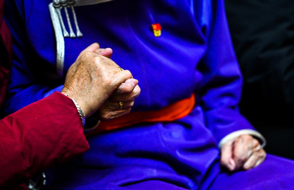 2024年11月20日,都贵玛和扎拉嘎木吉(右)合影时,紧握对方的手。