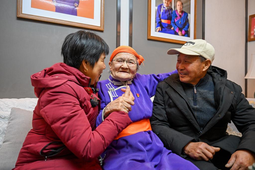 2024年11月24日,都贵玛(中)和杭巧云两口子交谈。