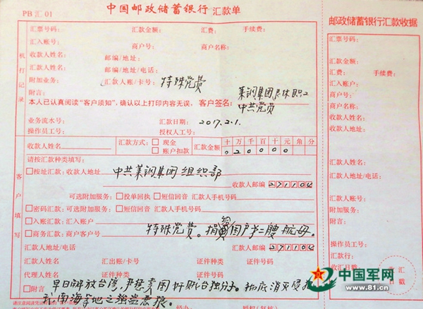 2月6日,山東省鋼鐵集團(tuán)有限公司萊鋼黨委組織部接到一張匯款單,金額為兩萬元整,簽名為“中共黨員、萊鋼集團(tuán)退休職工”,附言:“特殊黨費(fèi),捐給國產(chǎn)第二艘航母……”