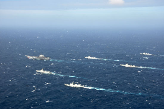2016年12月26日,執(zhí)行跨海區(qū)訓(xùn)練任務(wù)的中國(guó)海軍遼寧艦航母編隊(duì)。視覺中國(guó)供圖(資料圖片)