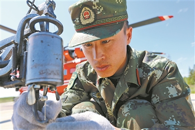 日曬、風(fēng)吹、雨淋,直升機(jī)的“衣服”——蒙布發(fā)生破損怎么辦?這可難不住心靈手巧的官兵。你看,武警森林指揮部直升機(jī)支隊(duì)的代理機(jī)械師王丹宇就自己動手,從老鄉(xiāng)那里借來手搖修鞋機(jī),頂著盛夏的烈日一針一線仔細(xì)修補(bǔ),看起來還挺有小裁縫的范兒呢。韓興華 攝