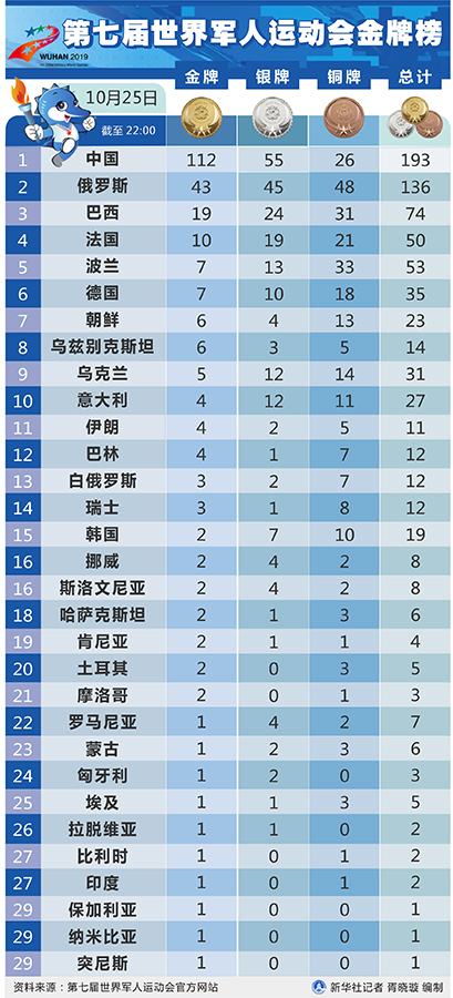 25日比賽結(jié)束后,中國軍團(tuán)以112金55銀26銅繼續(xù)位居金牌榜和獎牌榜首位,俄羅斯隊(duì)以43金45銀48銅位居金牌榜和獎牌榜次席,巴西隊(duì)以19金24銀31銅位居金牌榜和獎牌榜第三。