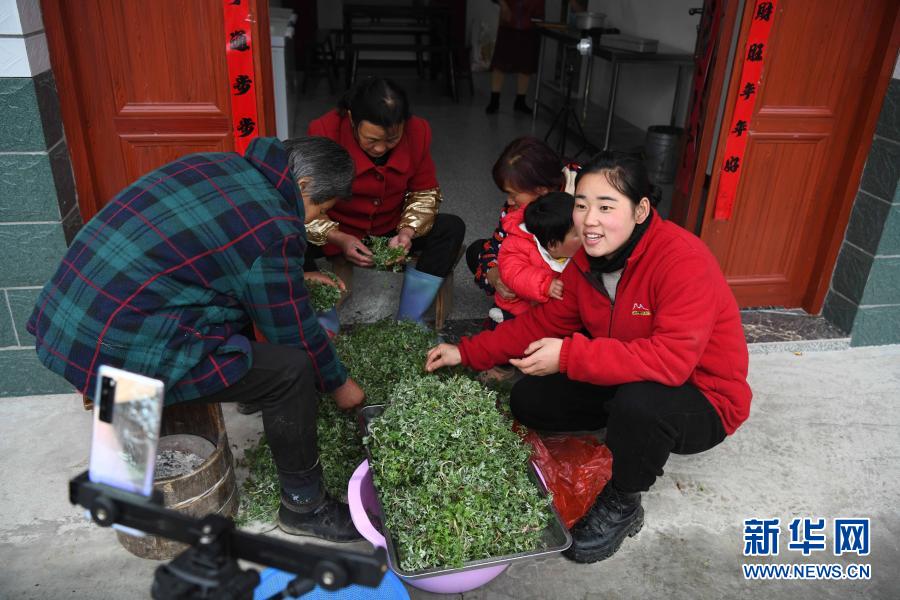 張志菊(右一)在直播村民制作蒿子粑粑的過(guò)程(2月26日攝)。