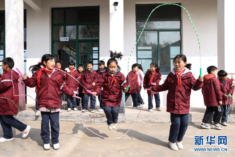 騎路小學(xué)三年級學(xué)生們在課間練習(xí)“三人車輪轉(zhuǎn)”跳繩(3月10日攝)。新華社記者 楊磊 攝