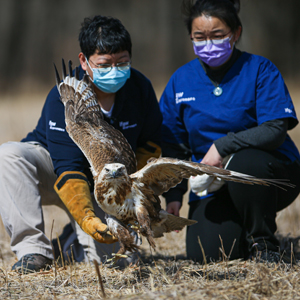 當(dāng)日,北京猛禽救助中心在北京市延慶區(qū)野鴨湖濕地公園附近空地放飛了兩只康復(fù)治療后的大鵟。此次放飛的兩只大鵟在去年12月分別被市民發(fā)現(xiàn),其中一只因饑餓、虛弱原因被救治,另一只因闖入市民鴿舍覓食被發(fā)現(xiàn)且身體有創(chuàng)傷被救治。經(jīng)過三個月的治療,兩只大鵟均已康復(fù)并達到了放歸野外標(biāo)準(zhǔn)。北京猛禽救助中心的猛禽康復(fù)師為兩只大鵟佩戴了GPS追蹤器,以監(jiān)測它們被放歸大自然后的情況。