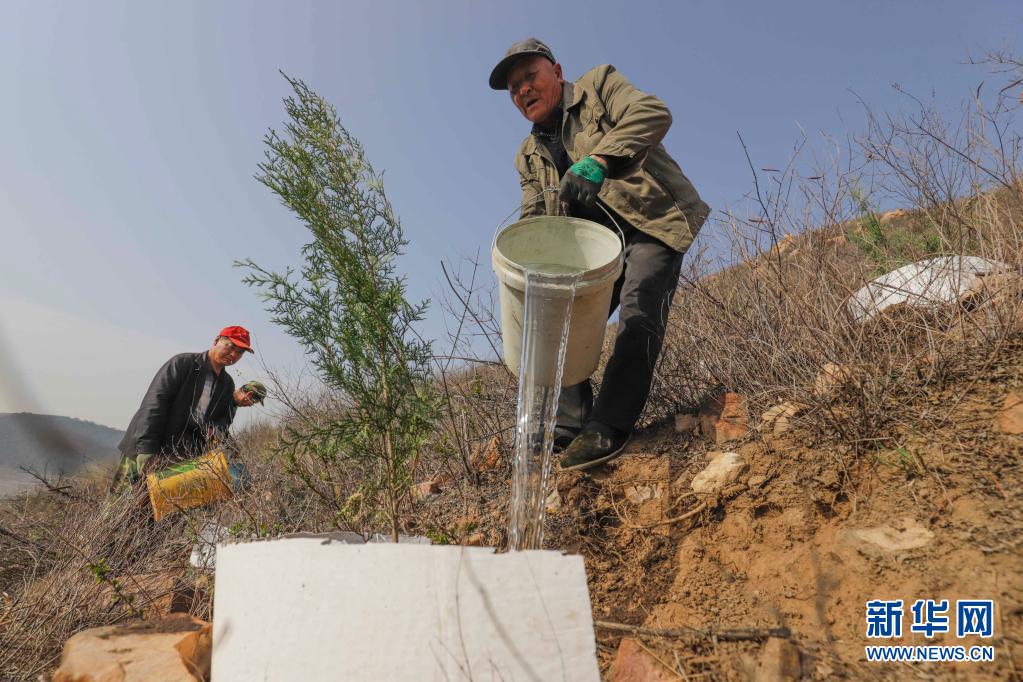 3月31日,造林隊(duì)員在河北省遵化市石門鎮(zhèn)金星山給新栽的樹(shù)苗澆水。
