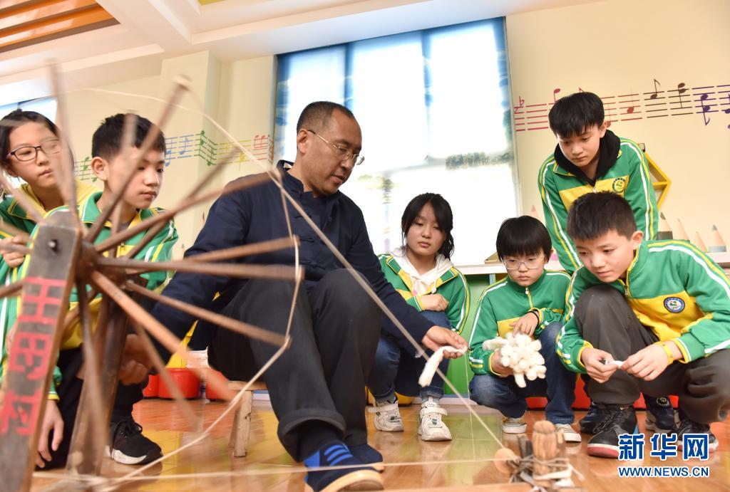 4月7日,威縣土布紡織技藝傳承人高慶海在威縣第四小學(xué)向?qū)W生演示老粗布紡織技藝。近年來,河北省邢臺市威縣積極開展“非遺傳承進(jìn)校園”活動,將當(dāng)?shù)靥厣沁z項(xiàng)目引入學(xué)校課堂,讓學(xué)生近距離感受民間傳統(tǒng)技藝的魅力,促進(jìn)非遺文化的保護(hù)和傳承。新華社記者 朱旭東 攝