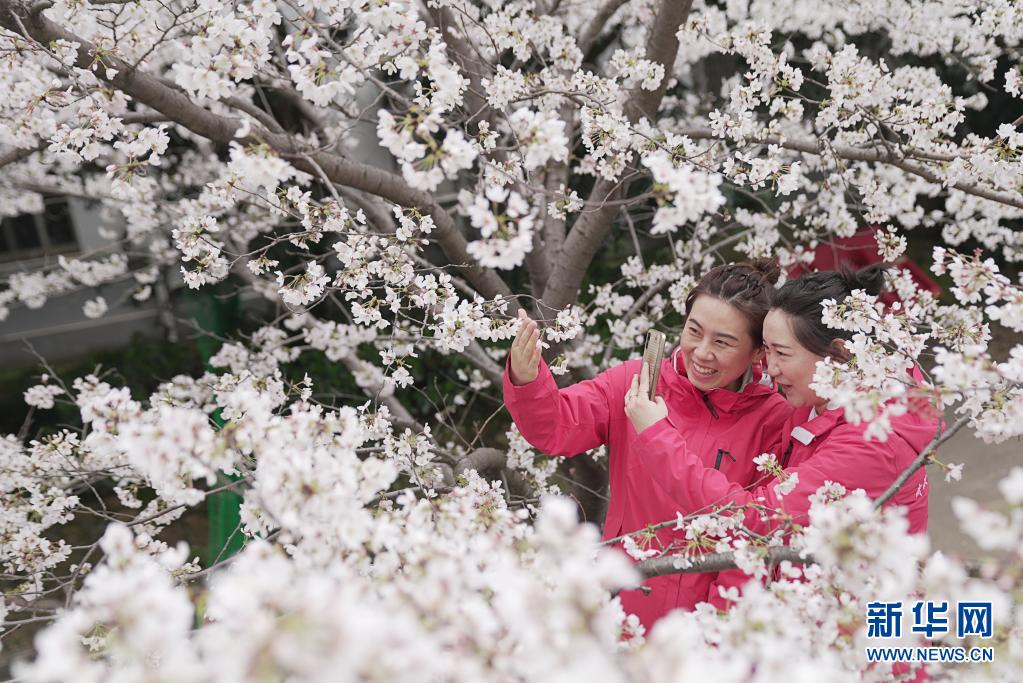 3月13日,武漢雷神山醫(yī)院醫(yī)護(hù)人員在櫻花樹(shù)下賞花。當(dāng)日,武漢大學(xué)抗疫醫(yī)護(hù)人員賞櫻專(zhuān)場(chǎng)啟動(dòng),來(lái)自全國(guó)各地的援鄂抗疫英雄在櫻花樹(shù)下重逢,盡享櫻花之約。新華社記者 熊琦 攝