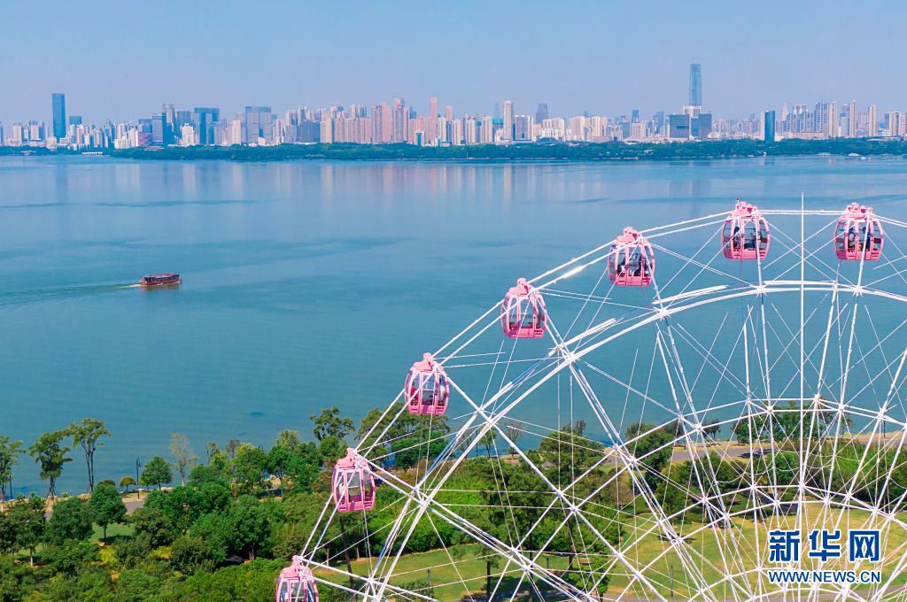 2020年8月17日拍攝的武漢“東湖之眼”摩天輪(無(wú)人機(jī)照片)。新華社記者 熊琦 攝