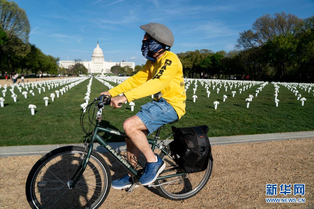 4月13日,一名男子騎車經(jīng)過美國(guó)華盛頓國(guó)家廣場(chǎng)草坪上擺放的白色絹花。