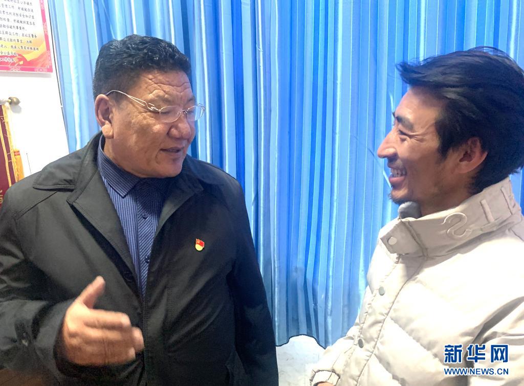 青海省玉樹藏族自治州玉樹市加吉娘生態(tài)移民社區(qū)黨支部書記土丁朋措(左)和社區(qū)工作人員交流(4月12日攝)。