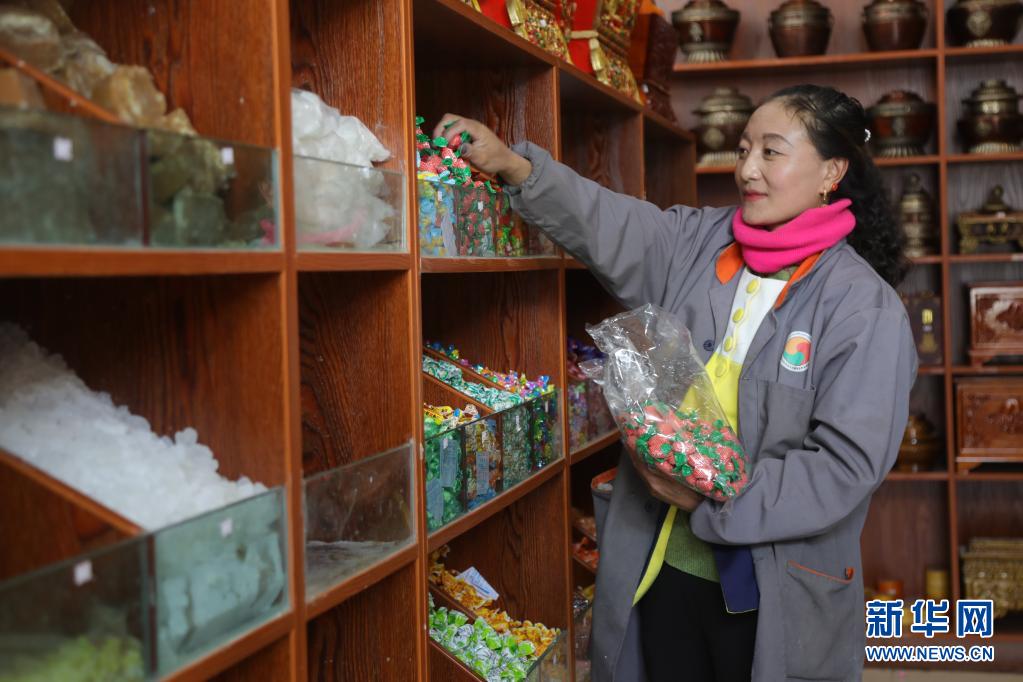 在青海省玉樹藏族自治州玉樹市甘達(dá)村利眾專業(yè)綜合合作社,超市售貨員才仁卓尕在整理貨架商品(4月10日攝)。