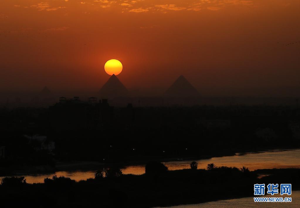 這是4月14日從埃及開(kāi)羅拍攝的吉薩金字塔群日落景色。新華社記者 王東震 攝