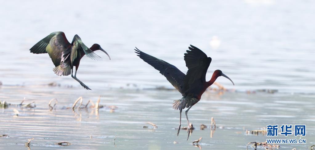 彩鹮在福建省霞浦縣福寧灣灘涂覓食、嬉戲(4月17日攝)。一對彩鹮近日現(xiàn)身福建省霞浦縣福寧灣灘涂的視頻,經(jīng)當(dāng)?shù)孛襟w播發(fā)后引起轟動,各地?cái)z影師及當(dāng)?shù)厣鷳B(tài)保護(hù)志愿者紛至沓來,一睹它們的“芳容”。新華社記者 梅永存攝