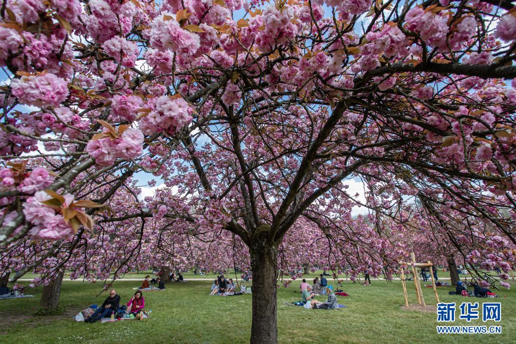 4月20日,人們在法國巴黎近郊的國璽公園欣賞櫻花。