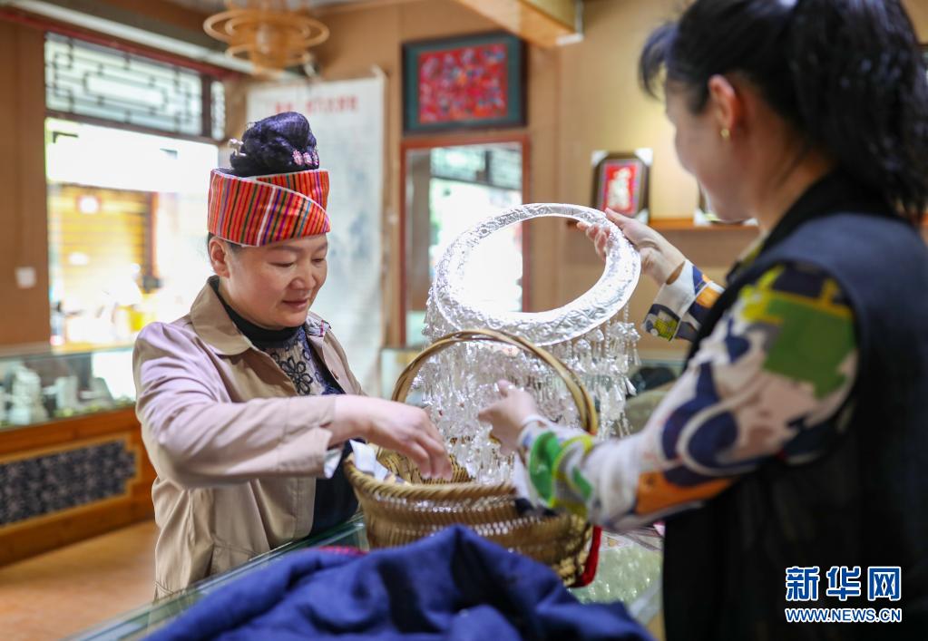 張佳麗的母親張元英(左)將苗族盛裝的銀飾拿到銀飾店清洗(4月23日攝)。