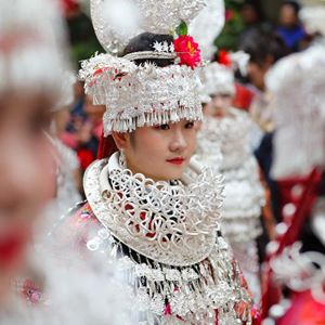 今年姊妹節(jié)前夕,母親張元英把女兒盛裝的銀飾拿到銀飾店里進行清洗,希望女兒能在盛裝巡演上展示最美的一面。4月25日姊妹節(jié)當天,張佳麗早早起床,在母親和同學的幫助下,開始化妝、穿衣、佩戴銀飾,一直忙到9點才準備完畢。身著盛裝站在巡演隊伍中,張佳麗說:“這是我們苗族同胞最大的節(jié)日,無論身處何地,我都會如約回家參加活動!”