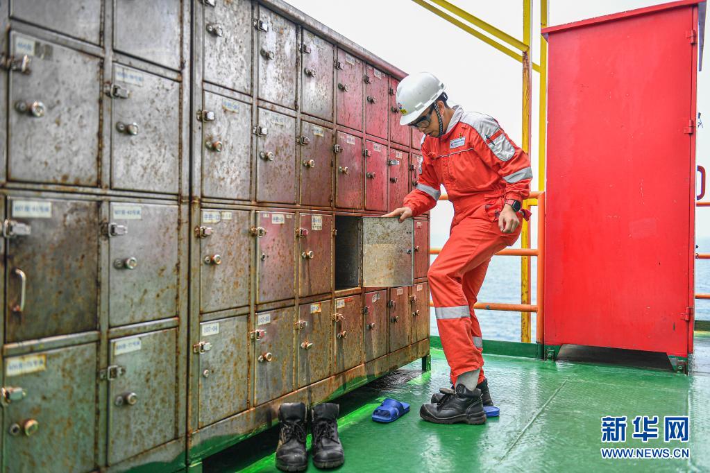4月25日,中國(guó)海油樂(lè)東15-1氣田上的一名工人在進(jìn)入氣田作業(yè)區(qū)之前戴上安全帽并換上有助于保護(hù)腳部的工作靴。