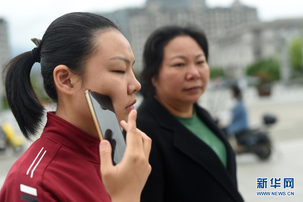 4月28日,葉景芬(前)和媽媽林鳳玉走在龍泉市街頭時(shí)接聽電話。新華社記者 韓傳號(hào) 攝