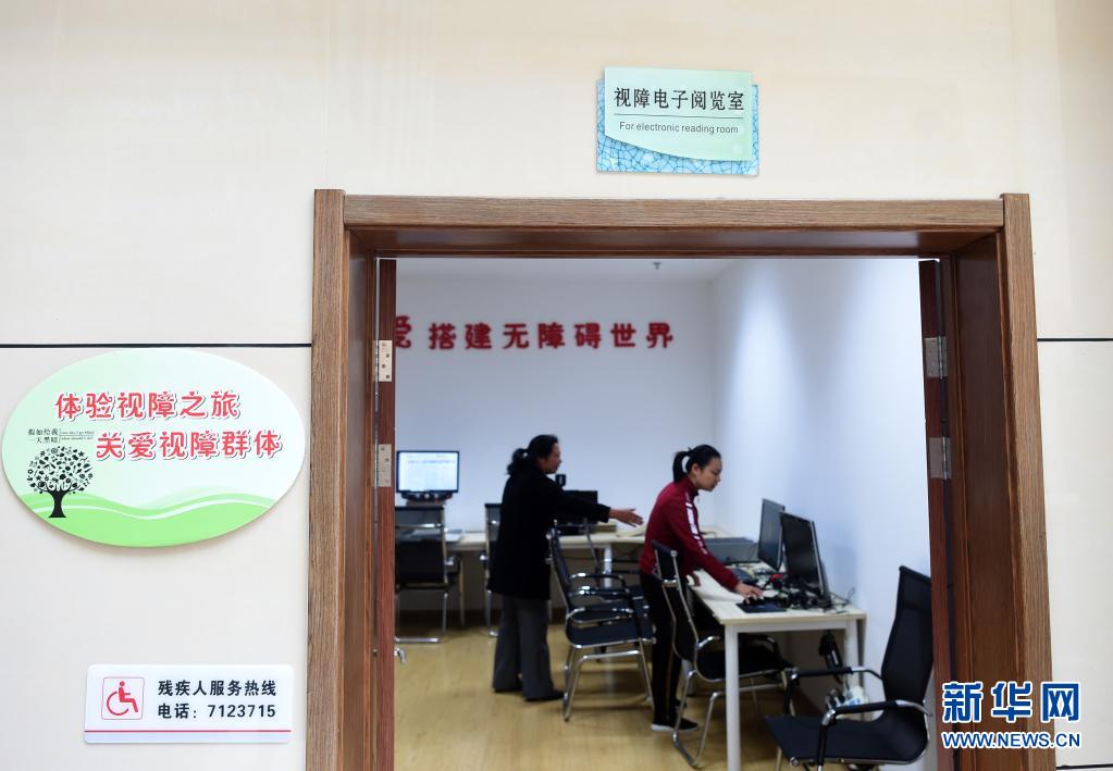 4月28日,葉景芬(右)在媽媽林鳳玉陪伴下,在龍泉市圖書館視障電子閱覽室查閱盲文資料。新華社記者 韓傳號 攝